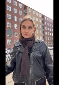 • Czarna skórzana bomberka o krótkim kroju, czarna długa sukienka, wzorzyste czarne botki do kostek, pleciona pomarańczowa torebka, szary dziany szalik, tło przyrody.