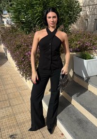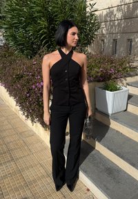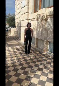 • Kobieta z czarną fryzurą typu bob, ubrana w czarny top na ramiączkach, czarne spodnie i szpiczaste buty, trzymająca koralikową torebkę obok schodów i roślin.