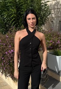 • Kobieta w czarnym bezrękawnym topie na szyję z guzikami z przodu, trzymająca koralikową kopertówkę, stojąca na oświetlonym słońcem chodniku, obok roślin.