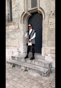 • Czarnobiała kamizelka w wzór houndstooth w oversize'owym fasonie, biała koszula, czarne skórzane kozaki do ud oraz mała kremowa torebka. Czapka z czarnego futra i okulary przeciwsłoneczne.