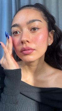 • Pomadka w srebrnej tubce nałożona na usta. Obiekt nosi czarny, żeberkowany top bez ramiączek i ma długie, falowane włosy. Tło miejskie.