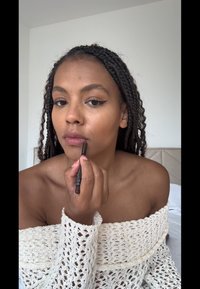 • Zbliżenie twarzy o ciemnej karnacji, z kręconymi włosami upiętymi z tyłu, subtelnym makijażem i kolczykami. Tło jest delikatnie rozmyte.