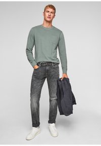 Beżowa bawełniana koszulka z krótkim rękawem, połączona z ciemnoniebieskimi dżinsami i jasnymi trampkami. Prosty, prostokątny krój.