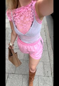• Różowa koronkowa bluzka nałożona na szary biustonosz, w zestawie z różowymi szortami. Modelka nosi brązowe zamszowe botki do kolan oraz wiele metalicznych pierścionków.