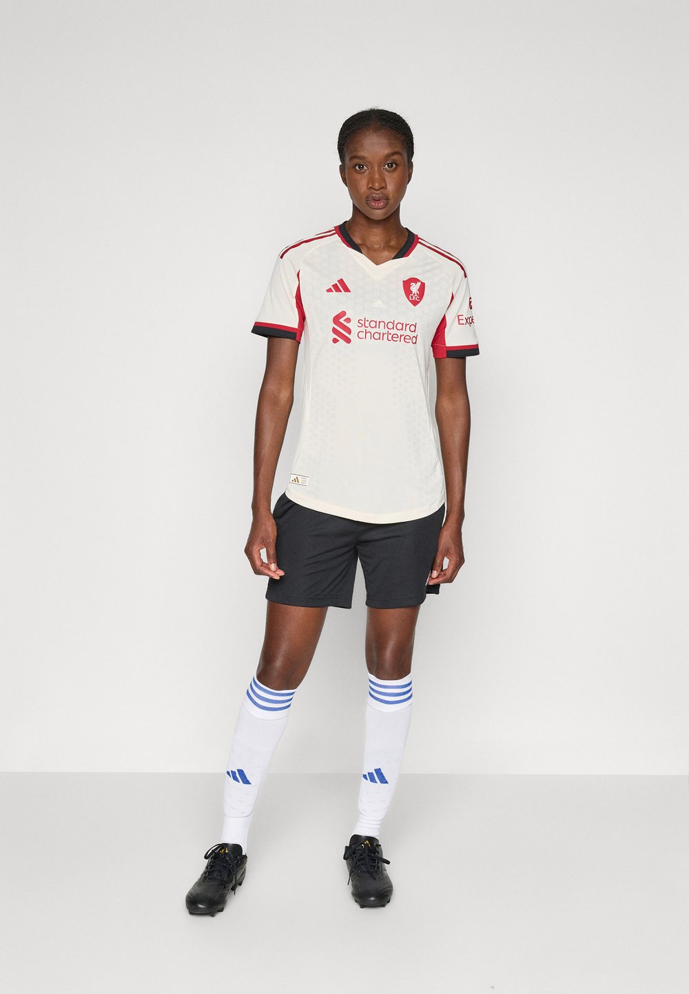 Kremowa koszulka piłkarska z czerwonymi akcentami i czarnymi spodniami. Czarny obuwie piłkarskie, czarne skarpetki w białe paski. Piłka ma wzór w gwiazdy.