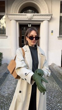 • Kobieta w beżowym trenczu, założonym na szary bezrękawnik i spodnie, trzymając tanową torebkę, a na rękach ma zielone skórzane rękawiczki, na brukowanej ulicy.