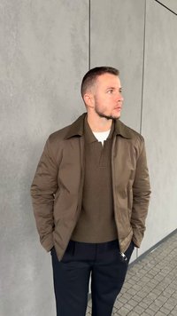 • Mężczyzna w beżowej kurtce na zamek błyskawiczny, pod którą ma beżowy, prążkowany sweter, oraz w granatowych spodniach, stoi na jasnoszarej, kafelkowanej nawierzchni.