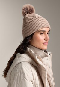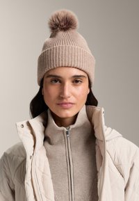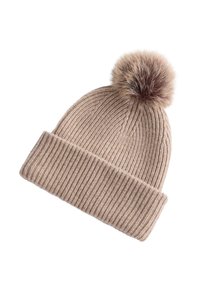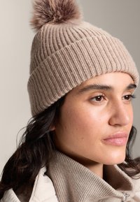 Jasnobeżowa prążkowana dzianinowa czapka z brązowym pomponem na czubku. Noszona z dopasowanym swetrem z wysokim kołnierzem i lekką pikowaną kurtką.