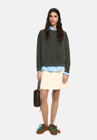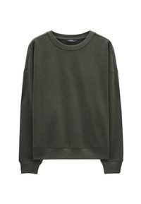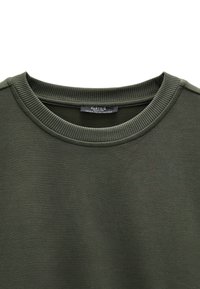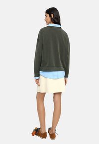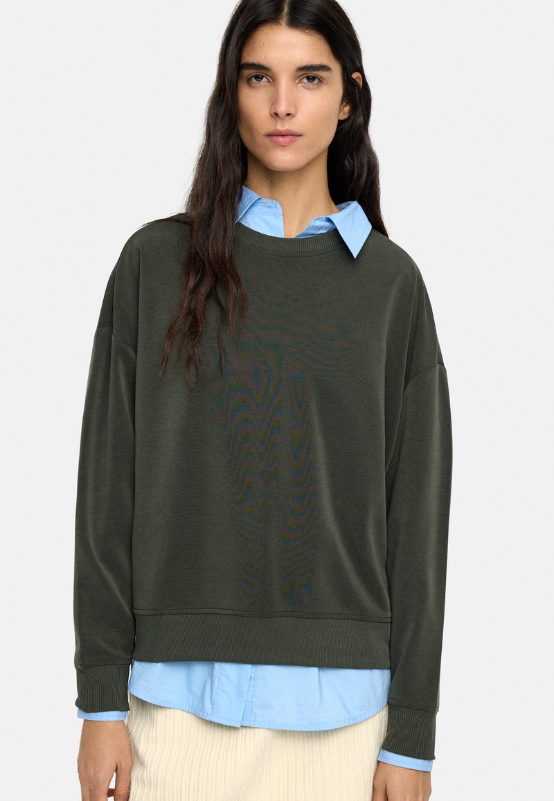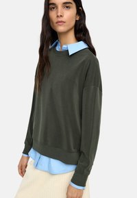 Bluza w kolorze oliwkowej zieleni wykonana z miękkiego materiału, z okrągłym dekoltem i opuszczonymi ramionami, noszona na jasnoniebieskiej koszuli z kołnierzykiem.
