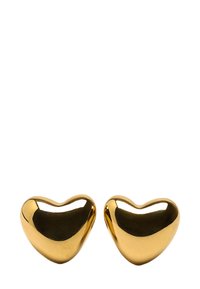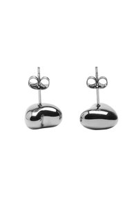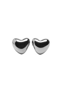 Srebrzyste, sercowe kolczyki o gładkiej, odblaskowej powierzchni. Wykonane z metalu, z zaokrąglonymi krawędziami i polerowanym wykończeniem.