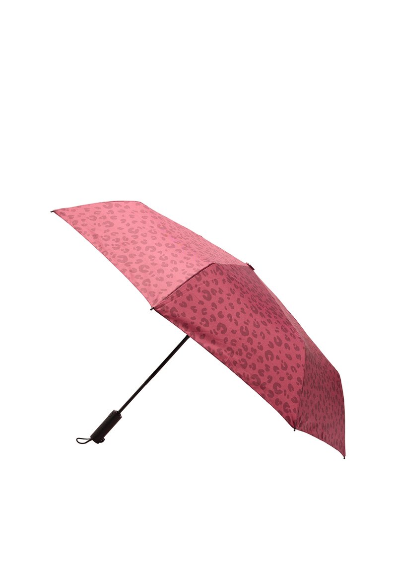 Różowy kompaktowy parasol z ciemnoróżowym wzorem w cętki lamparta i czarną rączką, pokazany otwarty na białym tle.