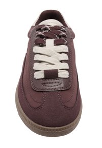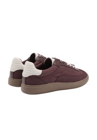 Niski but sportowy w ciemnym bordowym kolorze z białą łatką na pięcie, dwukolorowymi sznurówkami i brązową gumową podeszwą, pokazany z profilu na białym tle.