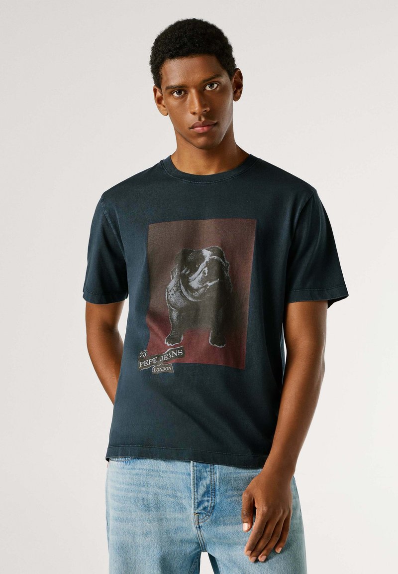 Czarny bawełniany t-shirt z nadrukiem psa w czerwonym prostokącie oraz napisem „Pepe Jeans London” na dole. Klasyczny fason z okrągłym dekoltem.
