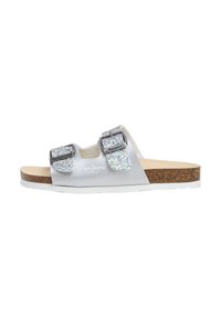 Różowy sandał na płaskiej podeszwie z korka, z białym spodem, dwoma błyszczącymi paskami z regulowanymi klamrami oraz logo "Pepe Jeans London" po boku.
