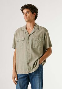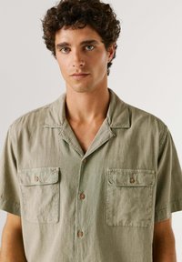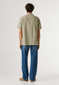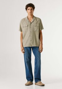 Młody mężczyzna z kręconymi włosami, ubrany w beżową koszulę na krótki rękaw z dwoma kieszeniami na piersi i niebieskie dżinsy, stojący na jednolitym tle.