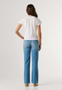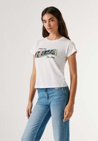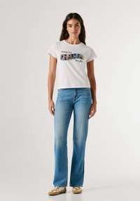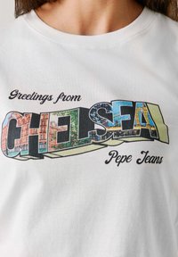 Biała bawełniana koszulka z krótkim rękawem, z kolorowym napisem "Greetings from CHELSEA". Połączona z jasnoniebieskimi jeansami.