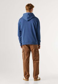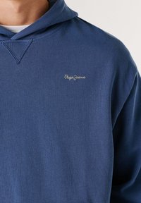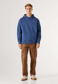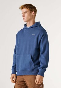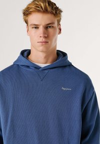 Niebieska bawełniana bluza z kapturem o teksturowanym wykończeniu, z przednią kieszenią, ściągaczami na rękawach i dekoltem w serek. Haftowane logo na górnej lewej stronie klatki piersiowej.