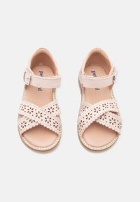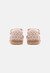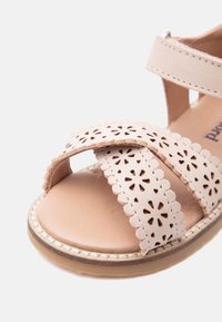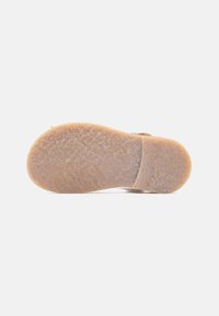 Beżowa skórzana sandał dziecięcy z perforowanymi kwiatowymi wzorami, regulowanym paskiem z klamrą i płaską gumową podeszwą.