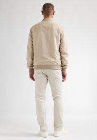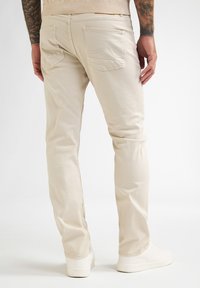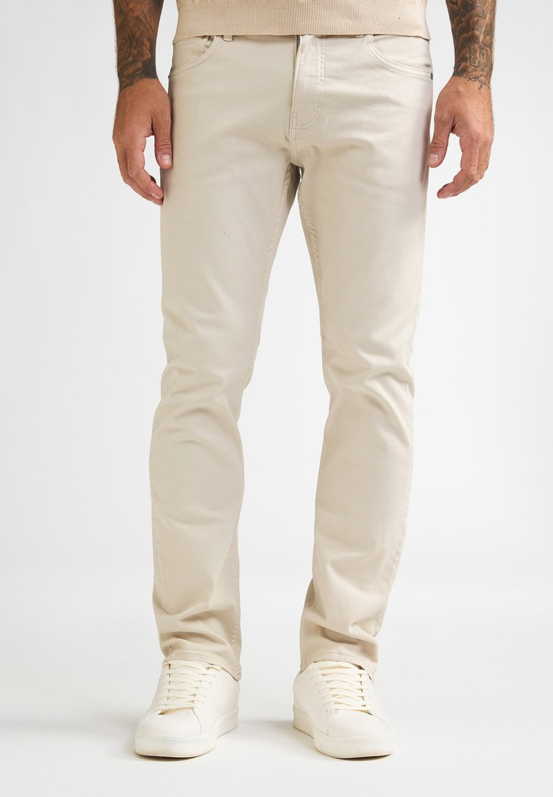 Beżowe jeansy o dopasowanym kroju, gładkiej fakturze, z pięcioma kieszeniami i jasnym przeszyciem, w połączeniu z białymi trampkami.