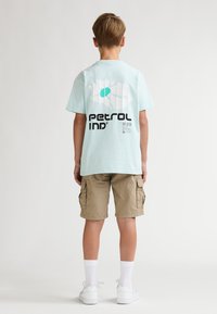 Jasnoniebieska bawełniana koszulka z małym nadrukiem na klatce piersiowej, w zestawie z beżowymi spodenkami cargo z bocznymi kieszeniami. Białe trampki i skarpetki.