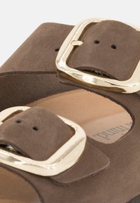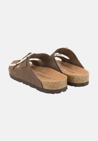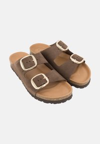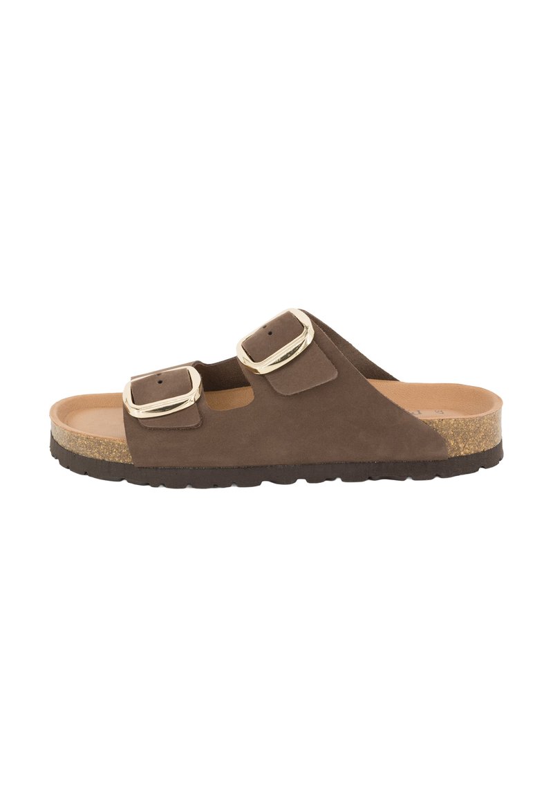 Brązowa zamszowa klapka z dwoma regulowanymi złotymi klamrami, korkową wkładką i czarną teksturowaną podeszwą.
