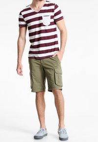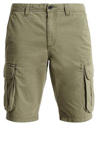 Oliwkowe szorty cargo z wieloma kieszeniami, szlufkami na pasek i prostym krojem. Noszone z jasnoniebieskimi butami. Materiał wydaje się lekki i trwały.