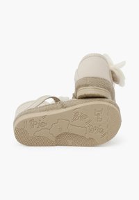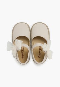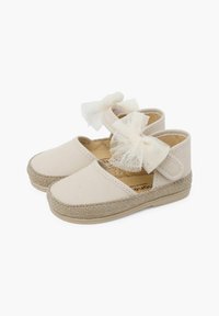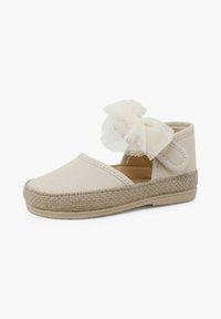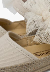 Beżowe espadryle z płótna z jucianą wkładką, z dużą kokardą z tiulu na pasku i zaokrąglonym czubkiem.