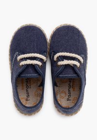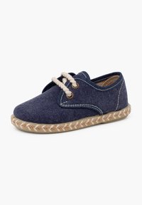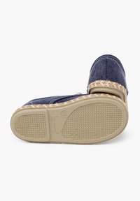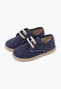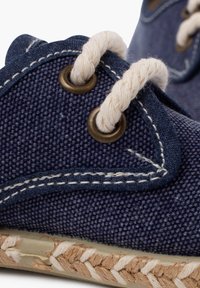 Granatowy materiałowy but z beżową podeszwą ze sznurka. Posiada zaokrąglony czubek, dwa oczka i jasne akcenty stębnowania wzdłuż krawędzi.