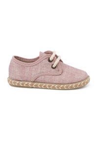 Szare płócienne buty z beżowym pikowaniem i sznurowadłami, z okrągłym noskiem i plecioną, jutową podeszwą. Wzór zawiera szczegóły w postaci dziurek.