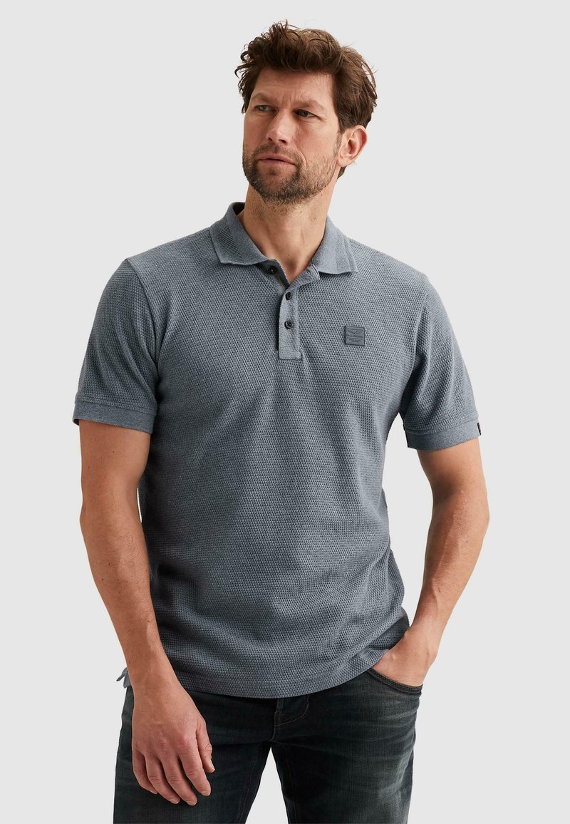 Mężczyzna z brodą, ubrany w szarą, fakturowaną koszulkę polo z krótkim rękawem i ciemne dżinsy, stojący z jedną ręką w kieszeni na jednolitym tle.