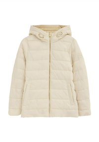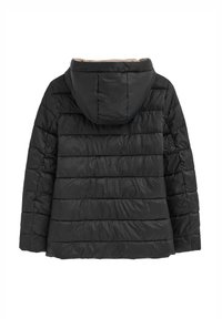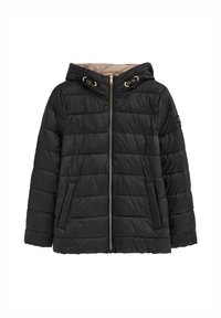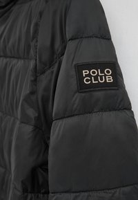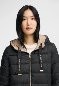 Kobieta o prostych czarnych włosach, ubrana w czarną pikowaną kurtkę z beżowym kapturem i czarnymi sznurkami z napisem "Polo Club".