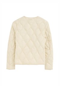 Młoda kobieta z prostymi czarnymi włosami, ubrana w białą koszulę z kołnierzykiem i jasnobeżową pikowaną kurtkę, stojąca na jednolitym tle.