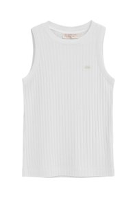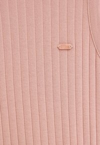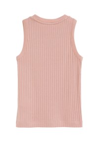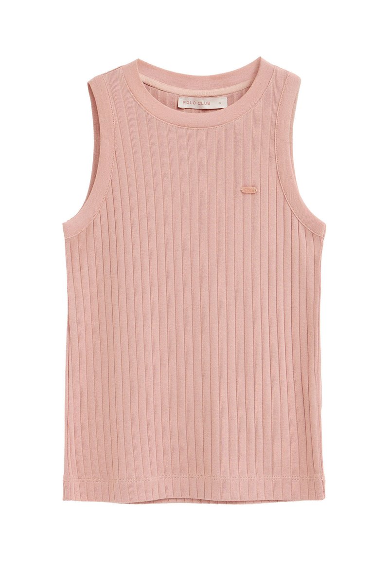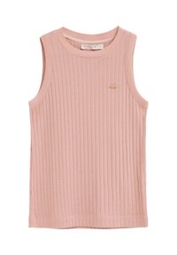 Bezrekawnikowy prążkowany top dzianinowy w miękkim różowym kolorze, z okrągłym dekoltem i małym naszytym logo na lewej piersi.