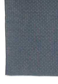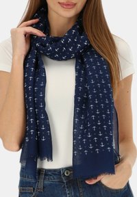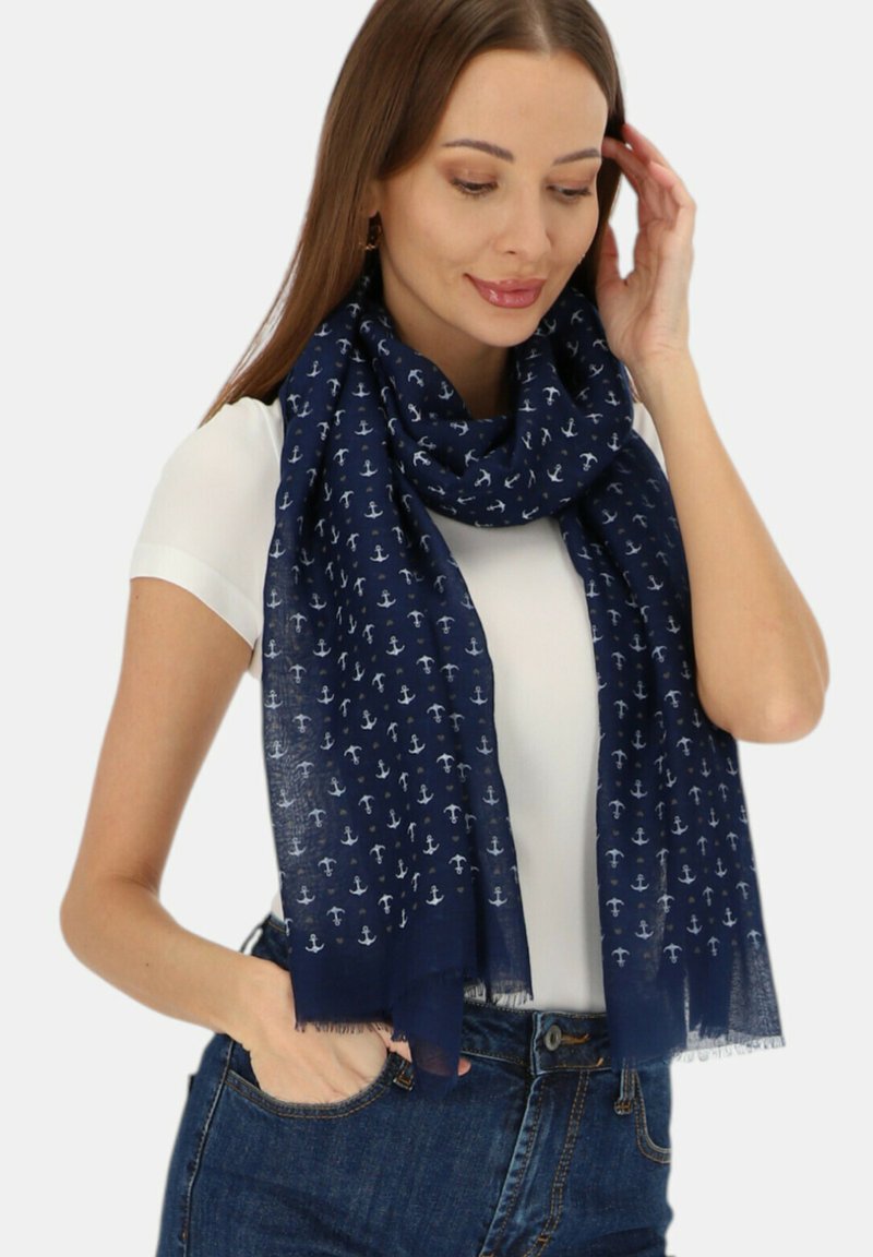 Kobieta ubrana w granatowy szalik z białymi wzorami kotwicy, białą bluzkę z krótkim rękawem i niebieskie dżinsy, dotykająca włosów jedną ręką.