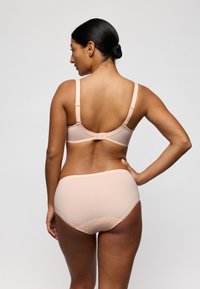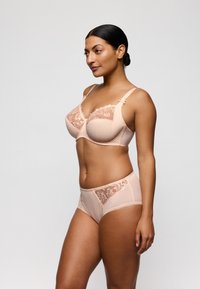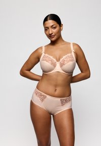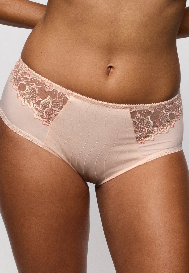Bielizna w kolorze brzoskwiniowym z koronką ozdobioną kwiatowymi wzorami. Główna część ma teksturowane pionowe paski i gładkie wykończenie.