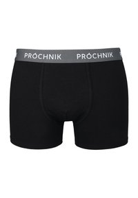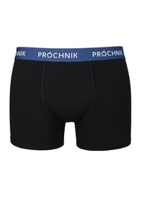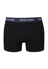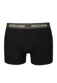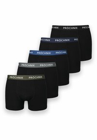 Czarny komplet pięciu bokserków z elastycznymi pasami w różnych kolorach: czarnym, ciemnoniebieskim, szarym i oliwkowym, z nadrukowanym logo marki "PROCHNIK".