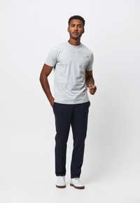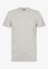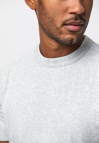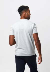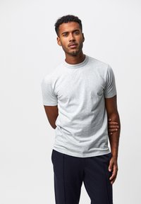 Mężczyzna o krótkich kręconych włosach, ubrany w jasnoszarą koszulkę i ciemne spodnie, stoi na tle jednolitego jasnego tła.