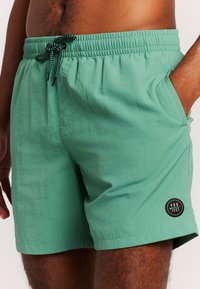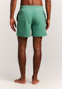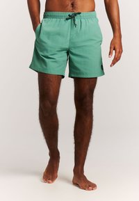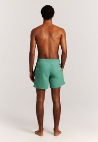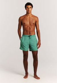 Mężczyzna w zielonych kąpielówkach ze ściągaczem stoi boso na jasnym tle, jedną ręką w kieszeni, drugą luźno opuszczoną wzdłuż ciała.