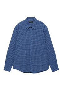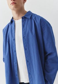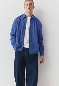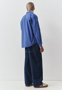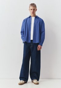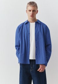 Młody mężczyzna stojący z rękami w kieszeniach, ubrany w niebieską koszulę w kratę, białą koszulkę, szerokie ciemne jeansy i beżowe sportowe buty.