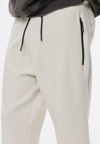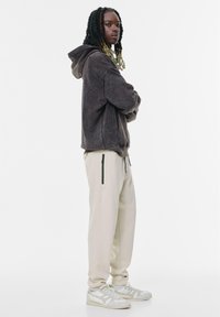 Kremowe spodnie dresowe o luźnym kroju, z elastycznym paskiem i bocznymi kieszeniami; zestawione z jasnymi, teksturowanymi sneakersami. Na górze ciemny hoodie.
