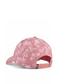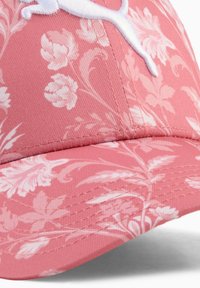 Różowa czapka w kwiatowy wzór z białym logo Puma, wykonana z miękkiej tkaniny, z zakrzywionym daszkiem i regulowanym paskiem z tyłu.