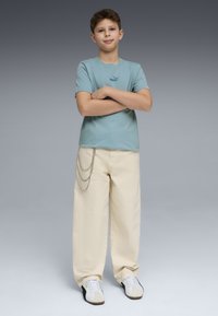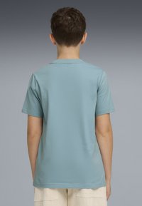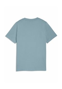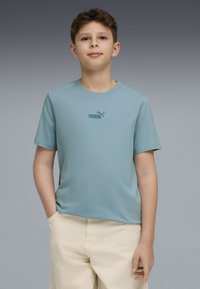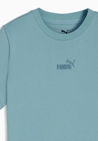 Jasnoniebieska koszulka Puma z krótkim rękawem, dekoltem typu crew neck i małym haftowanym logo Puma na środku klatki piersiowej.