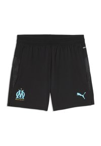 Granatowa i jasnoniebieska koszulka piłkarska z logo, w połączeniu z czarnymi spodniami i białymi skarpetkami. Dziecko stoi na niebiesko-czarną piłce nożnej.
