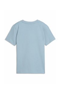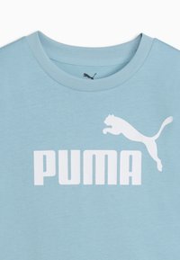 Dziewczyna w jasnoniebieskiej koszulce Puma, czarnej spódnicy i czarnych butach Puma, trzymająca czarną torebkę Puma, stoi na szarym tle.