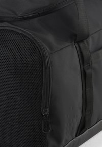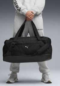 Czarna torba typu duffel z regulowanym paskiem na ramię, zamkami błyskawicznymi i białym logo. Wykonana z wytrzymałego materiału o gładkiej powierzchni.