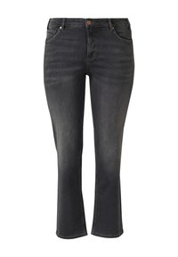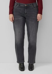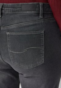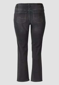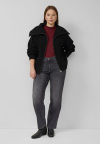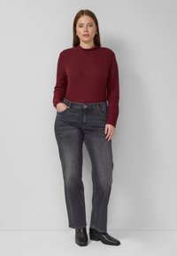 Osoba w wyblakłych czarnych prostych dżinsach, czarnych botkach z kwadratowym noskiem oraz długim rękawem czerwonego prążkowanego topu, stojąca na szarym tle.