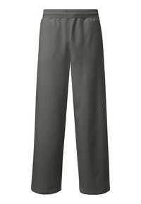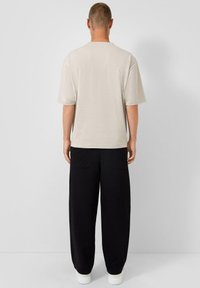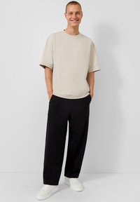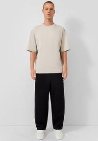 Mężczyzna ubrany w beżowy, oversize'owy t-shirt z krótkim rękawem, czarne szerokie spodnie i białe sneakersy, stojący na tle jednolitego jasnoszarego tła.