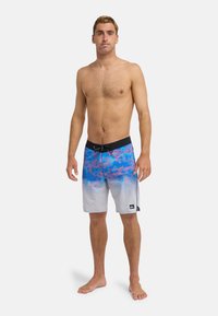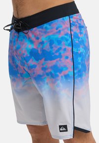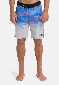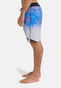 Męskie kąpielówki typu board shorts w gradiencie niebiesko-różowym na szarej bazie. Posiadają sznurek do regulacji w pasie, boczne kieszenie oraz małą naszywkę z logo.