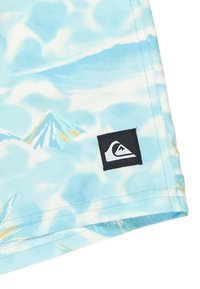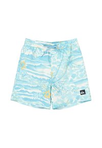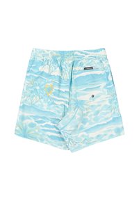 Niebiesko-białe szorty kąpielowe z tropikalnym nadrukiem palm, gór i żółtych kwiatów, z wiązaniem w pasie i naszywką z logo.