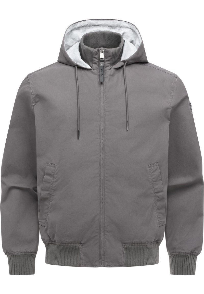 Szara kurtka z kapturem na zamek z przodu, z prążkowanymi mankietami i dołem, dwoma skośnymi kieszeniami oraz sznurkami na kapturze.